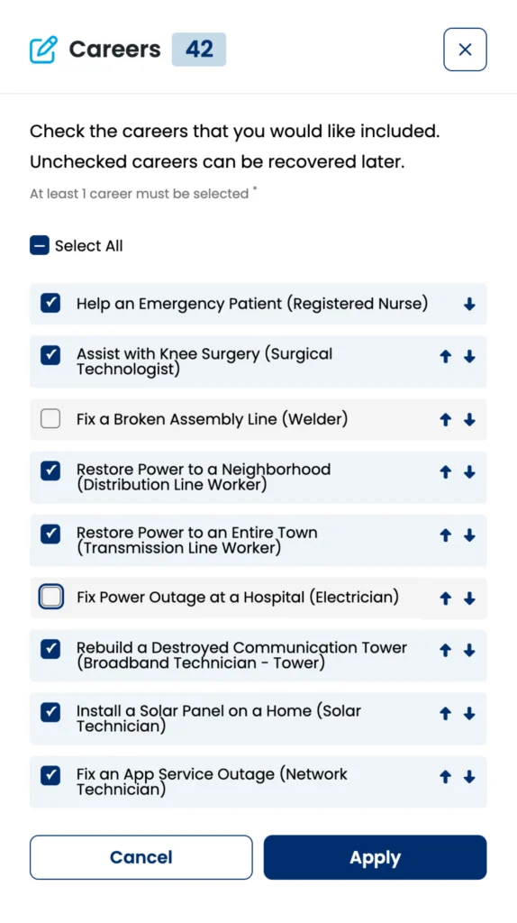 - Career assessment and matching: Learners complete a short survey of their interests and skills, then receive career matches that they can review to align their career paths with their preferences, motivations, and values.