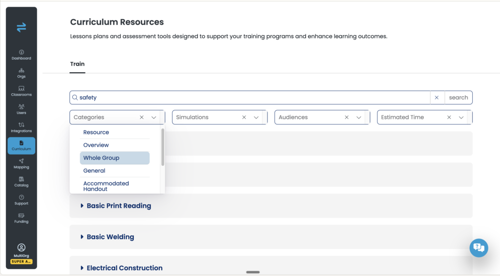 Our new curriculum planning resource features over 350 activities and lessons mapped to ACTE clusters, including ready-made lesson plans, materials lists, and out-of-headset activities. These resources will help support integrating training simulations from Transfr into an existing program and can be found under a new "Curriculum Resources" tab in the navigation menu.