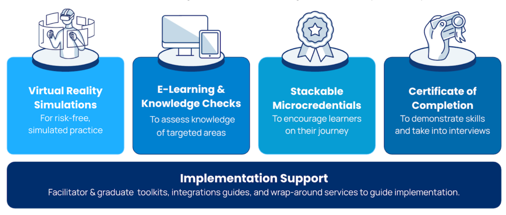 Pre-Employment programs combine engaging VR experiences with e-learning activities and assessments, allowing participants to build foundational skills while earning microcredentials and a certificate of completion.