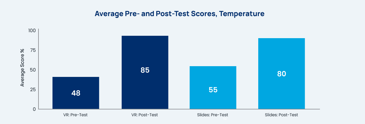 All participants took a post-test after completing the VR simulation or studying the slides at their own pace. Post-tests were designed to mimic the exams that nursing and allied healthcare workers encounter. In both studies, the VR group showed higher overall average post-test scores and higher average learning gains. In the Temperature study, the VR group had an average post-test score of 85%; the slides group’s average score was 80%.