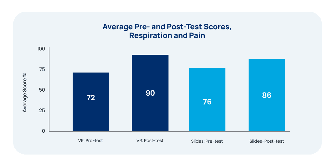 Similar to the Temperature group, the VR group in the Respiration and Pain study also showed higher average post-test scores and higher average learning gains. The average score for the VR learning group was 90%, compared to the slides group which had an average score of 86%.