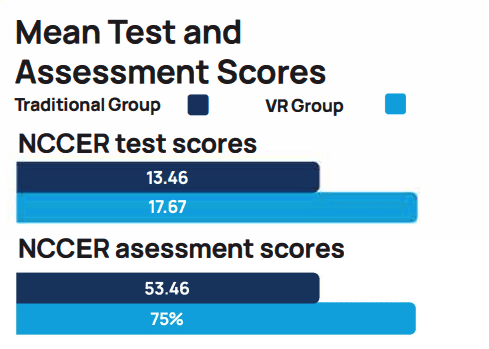 The VR group did better than the traditional group on both evaluations: The average test score from the Traditional group was lower (Mean =13.46; Standard Error = 1.96) than the VR group (M = 17.67; SE = 1.45). The average NCCER assessment score from the Traditional group was lower (M = 53.46, SE = 10.88) than the VR group (M = 75, SE = 5.16). 100% of students who chose the VR option completed the NCCER evaluation and succeeded in securing jobs post-training, vs a completion and job-placement rate of 69% for the non-VR control group.