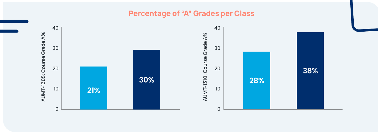 In 2023, Transfr researchers partnered with Texas State Technical College (TSTC) to measure student performance and compare classes conducted before integration of VR into automotive programs to those with VR. The introduction of VR is associated with the marked increase in the incidence of “A” grades in 2022 (see chart below).
