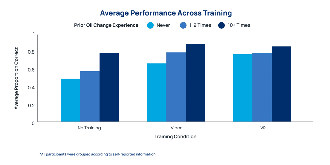 It is exciting to see that Transfr VR training can enable novices to realize similar performance in the Oil Change task as those who report having moderate levels of real-world experience.