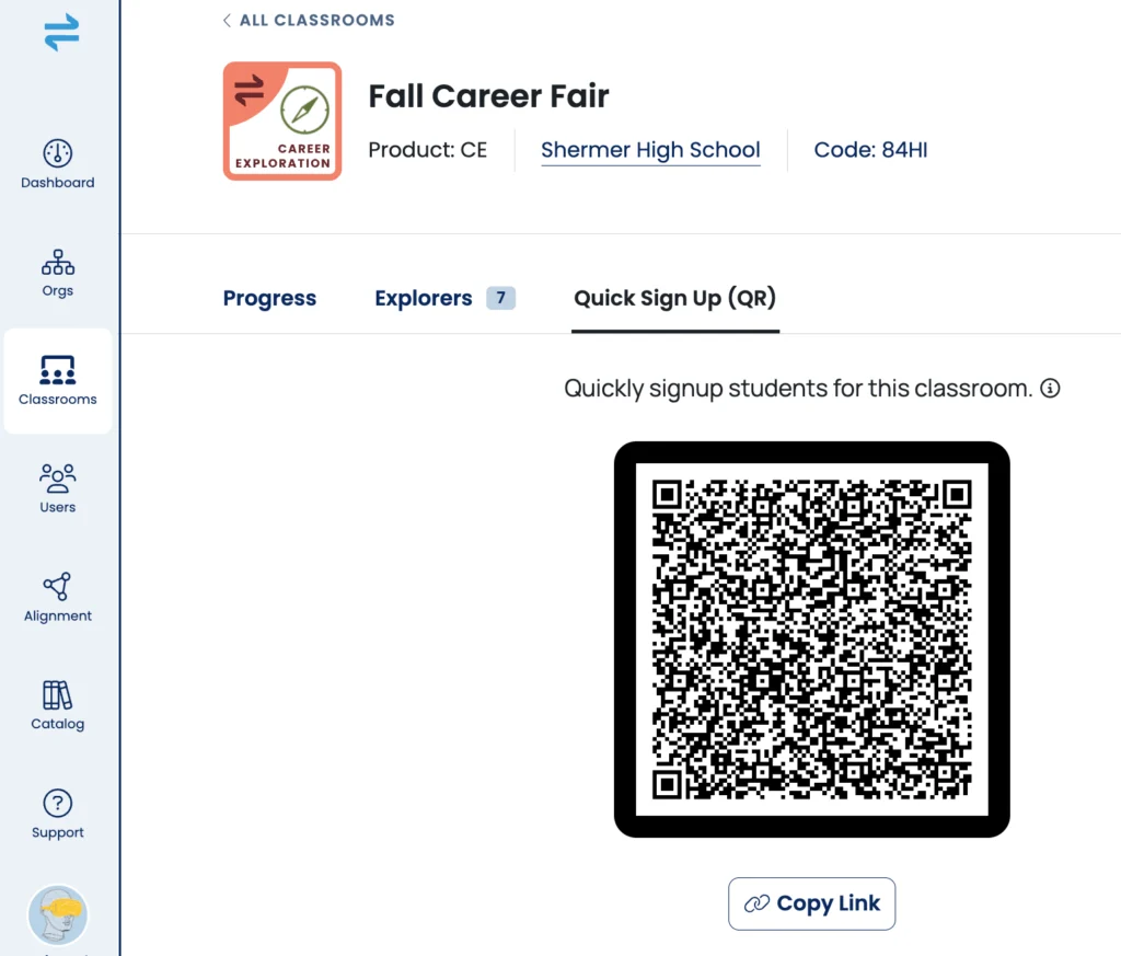 - Instructors click on the Quick Sign Up (QR) button within their Classroom tab to reveal a class-specific QR code. This QR code can be printed or displayed on a monitor. Additionally, a unique link can be shared through email or text.